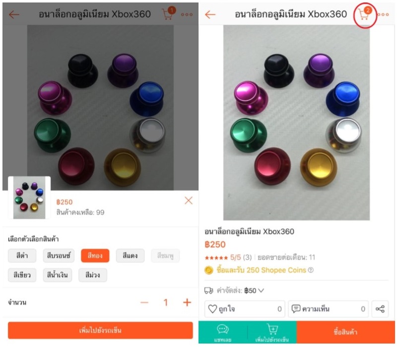 กดเพิ่มไปยังรถเข็น จะเห็นได้ว่าที่รถเข็น จะมีเลข 2 แสดงสถานะ