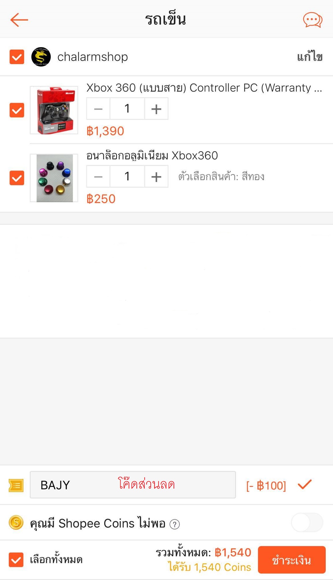 ในช่อง "โค๊ดส่วนลด" ให้ดูที่หน้าร้านจะมีโค๊ดแปะไว้ให้ บางโค๊ด